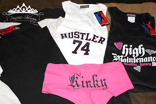 Yoga pants, hustler and high maintenance tank tops and some “Kinky” hot shorts. Meeeow!
