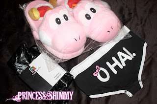 Some cute Yoshi plush slippers, liquid latex tights and a pair of O Hai briefs.