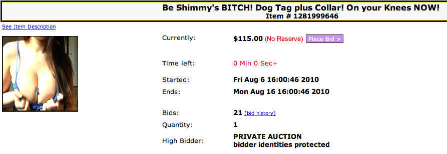 Oh and I almost forgot about one of My recent epic ebanned auctions. You bitches paid $115 for My dog’s stinky, old dog collar. LMAO! Hey, you know it’s worth it right bitch? This collar came with one of My custom inscribed “Shimmy’s Bitch” dog tags, which makes it sooo much more special.